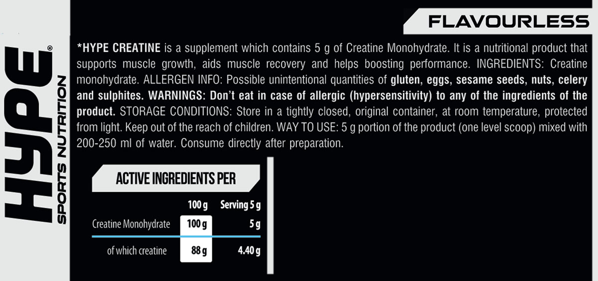 کراتین مونوهیدرات خالص هایپ، قدرت عضلانی، انفجاری بودن و ریکاوری سریعتر را تضمین میکند. هر دوز حاوی ۵ گرم کراتین، بدون افزودنی است. در بسیاری از مطالعات نشان داده شده است که کراتین، قدرت و استقامت عضلانی را افزایش میدهد، زمانی که بدن با سبک تمرینی که نیاز به شدت بالا و ستهای کوتاه مدت دارد، تمرین داده میشود.