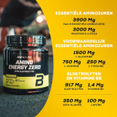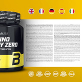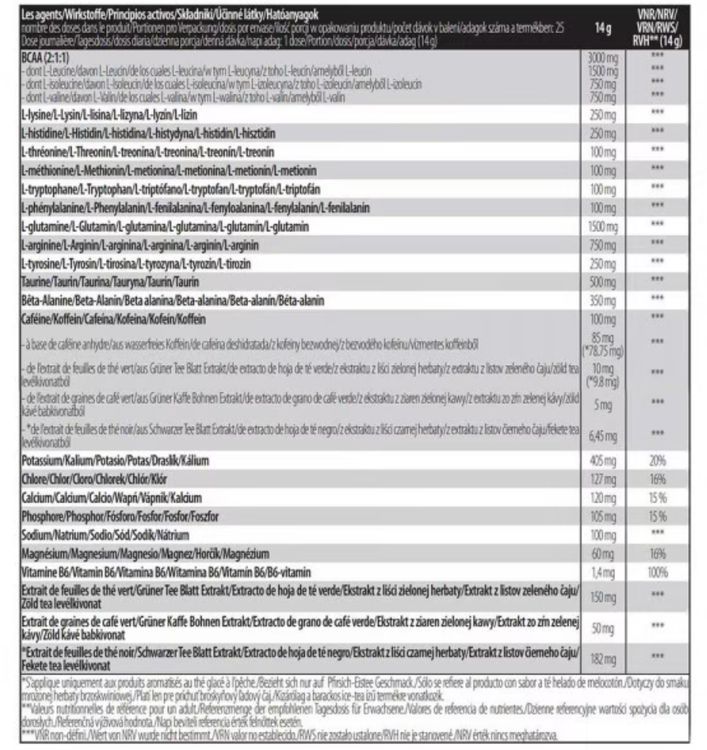 آمینو انرژی زیرو با الکترولیت (۳۶۰ گرم) حاوی ۹ اسید آمینه ضروری ، از جمله BCAA (لوسین، ایزولوسین و والین) با نسبت ۲:۱:۱ است. همچنین ال-گلوتامین، ال-آرژنین و ال-تیروزین برای پشتیبانی از شما در طول شدیدترین تمرینات ورزشی وجود دارد.