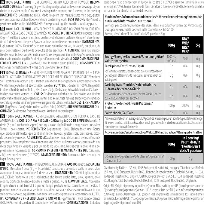 هر وعده از ال-گلوتامین ۱۰۰٪ بایوتک آمریکا، ۵۰۰۰ میلیگرم ال-گلوتامین فراهم میکند که آن را برای استفاده قبل و بعد از تمرین ایدهآل میکند. این اسید آمینه ضروری به گونهای طراحی شده است که بدون افزودن مواد دیگر، به طور مؤثر مصرف شود و کیفیت و خلوص آن تضمین شود.