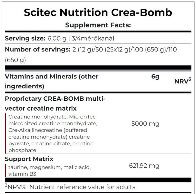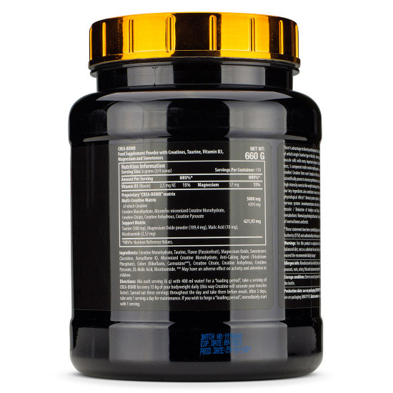 ویتامین B3 (نیاسین)، منیزیم، ماتریس اختصاصی "CREA-BOMB"، شامل کراتین ۴۳۹۳ میلیگرم، کراتین مونوهیدرات، کراتین مونوهیدرات میکرونیزه MicronTec، Kre-Alkalyn® (کراتین مونوهیدرات بافر شده)، کراتین سیترات، کراتین بدون آب، کراتین پیروات، تورین (۵۰۰ میلیگرم)، پودر اکسید منیزیم (۱۰۹.۴ میلیگرم)، اسید مالیک (۱۰ میلیگرم)، نیکوتین آمید (۲.۵۲ میلیگرم)، کراتین مونوهیدرات، تورین، طعم (لیموناد صورتی)، اکسید منیزیم، عامل ضد کلوخه شدن (تری کلسیم فسفات)، کراتین مونوهیدرات میکرونیزه، رنگ (قرمز چغندر)، شیرینکنندهها (آسهسولفام K، سوکرالوز)، تنظیمکننده اسیدیته (اسید سیتریک)، Kre-Alkalyn® [کراتین مونوهیدرات بافر شده]، کراتین سیترات، کراتین بدون آب، کراتین پیروات، دی ال-مالیک اسید، نیکوتین آمید.