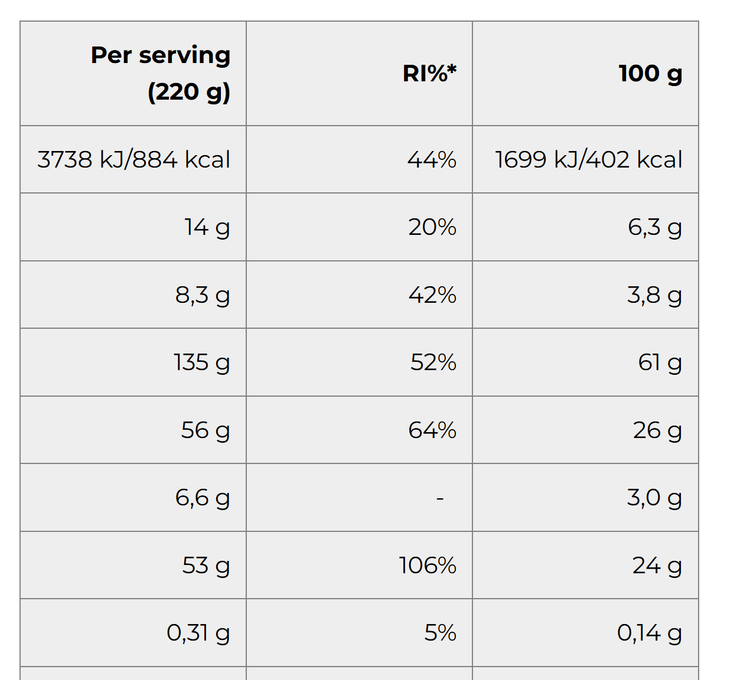 - ۱۳۵ گرم کربوهیدرات و ۵۳ گرم پروتئین در هر وعده