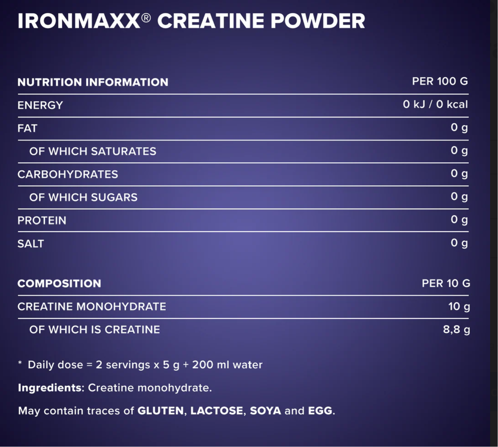 - کراتین خالص: کراتین مونوهیدرات با کیفیت بالا از IronMaxx® به شکل پودر با قابلیت ترکیب آسان.