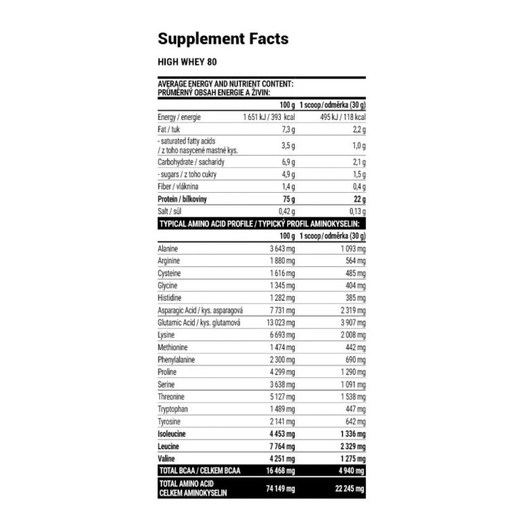ترکیبی از دو منبع پروتئین - کنسانتره پروتئین آب پنیر و پروتئین ایزوله CFM - مزایای هر دو را به شما میدهد - طعم فوقالعاده خوشمزه، غلظت عالی، ارائه مواد مغذی عالی، قابلیت هضم بسیار خوب و همه اینها با قیمتی بسیار مناسب! پروتئینهای موجود در High Whey 80 با آنزیمهای پاپائین و تولراز (لاکتاز با pH پایدار) تکمیل شدهاند. مصرف این منبع پروتئینی با کیفیت بالا به رشد توده عضلانی و حفظ آن در شرایطی که توسط کاتابولیسم تهدید میشود، کمک میکند.