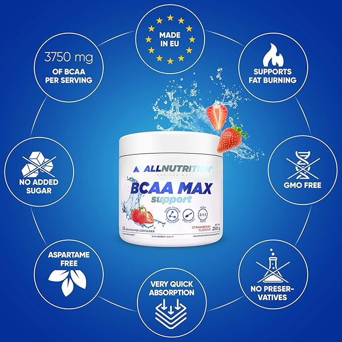 مکمل BCAA MAX SUPPORT آل نوتریشن ، ترکیبی از آمینو اسیدهای شاخهدار (BCAA) با نسبت ۲:۱:۱ (ال-لوسین: ال-والین: ال-ایزولوسین) است که برای پشتیبانی از بدن در حین و بعد از ورزش طراحی شده است. BCAA MAX SUPPORT با ال-گلوتامین و تائورین برای حداکثر پشتیبانی از تمرین، تقویت شده است.