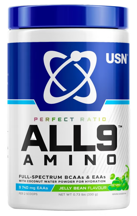 طیف All9 Amino شرکت USN شامل 9 اسید آمینه ضروری است که بدن شما نمیتواند به طور طبیعی تولید کند. مزایای مکمل این آمینو اسیدها بسیار زیاد است. اسیدهای آمینه به عنوان بلوکهای سازنده پروتئینهایی عمل میکنند که عملکردهای مختلفی را در سراسر بدن انجام میدهند. All9 Amino همچنین حاوی AstraGin است که جذب آمینو اسیدها را افزایش میدهد و بدن را قادر میسازد تا از آنها به درستی استفاده کند.
