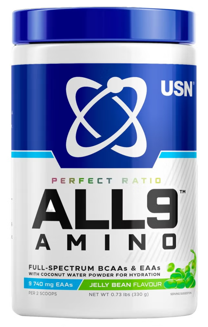 طیف All9 Amino شرکت USN شامل 9 اسید آمینه ضروری است که بدن شما نمیتواند به طور طبیعی تولید کند. مزایای مکمل این آمینو اسیدها بسیار زیاد است. اسیدهای آمینه به عنوان بلوکهای سازنده پروتئینهایی عمل میکنند که عملکردهای مختلفی را در سراسر بدن انجام میدهند. All9 Amino همچنین حاوی AstraGin است که جذب آمینو اسیدها را افزایش میدهد و بدن را قادر میسازد تا از آنها به درستی استفاده کند.