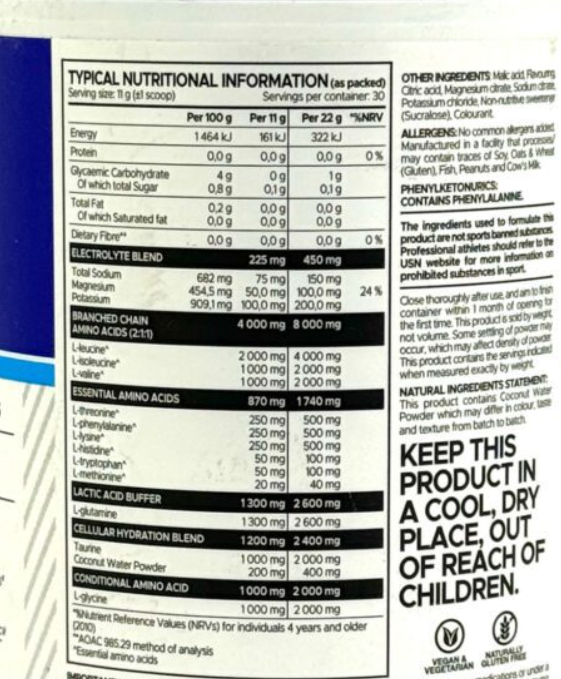 ترکیبات: ال-گلوتامین: از درد عضلات جلوگیری کرده و به ریکاوری کمک میکند. الکترولیتها و پودر آب نارگیل: عضلات را آبرسانی کرده و از گرفتگی عضلات جلوگیری میکند. آستراگین : جذب سریعتر مواد مغذی در بدن را ممکن میسازد و به بدن شما اجازه میدهد مواد مغذی را سریعتر به انرژی تبدیل کند.