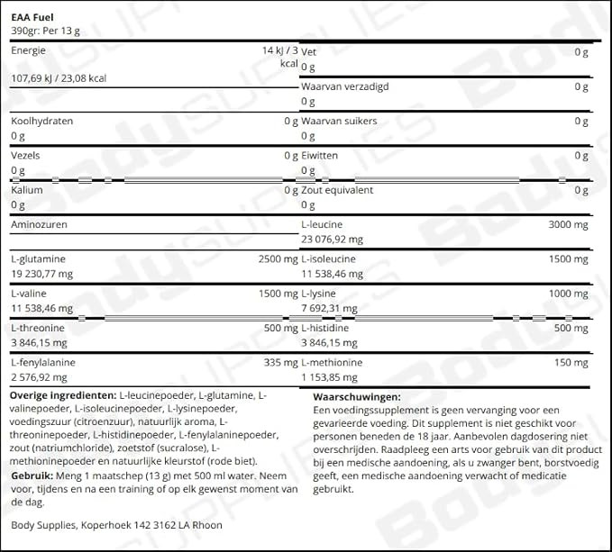- ۹ گرم EAA شامل ۶ گرم آمینواسیدهای شاخهدار (BCAA) با نسبت ۲:۱:۱ (۳۰۰۰ میلیگرم ال-لوسین، ۱۵۰۰ میلیگرم ال-ایزولوسین، ۱۵۰۰ میلیگرم ال-والین). همچنین حاوی ۲.۵ گرم ال-گلوتامین اضافی است.