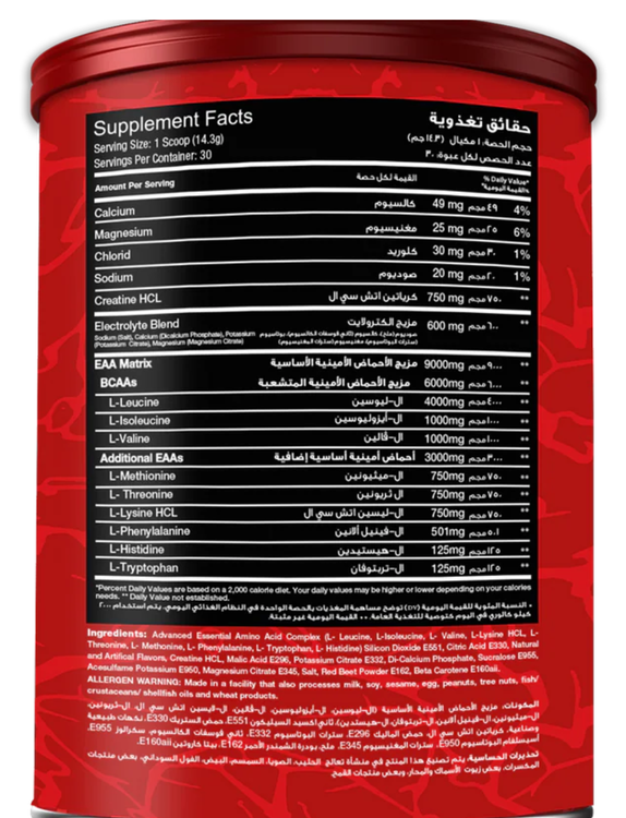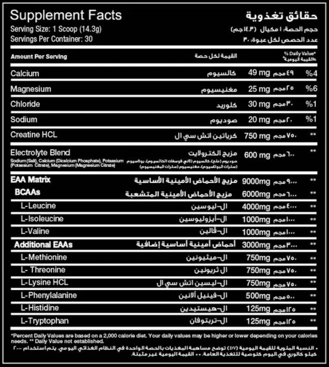 - نسبت بهینه BCAA: حاوی نسبت ۲:۱:۱ از لوسین، ایزولوسین و والین برای ترمیم عضلات و ریکاوری پس از تمرین است و به جلوگیری از تجزیه عضلات در طول تمرینات کمک میکند.