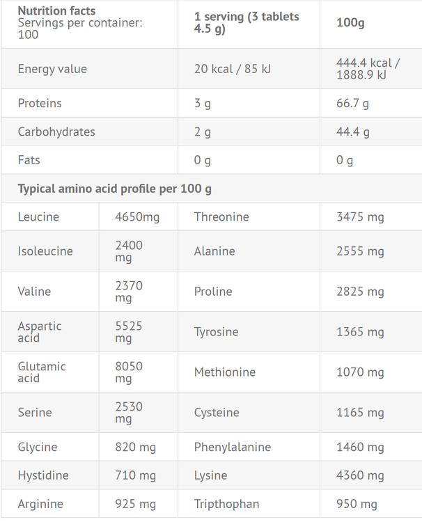 پودر آب پنیر ، کنسانتره پروتئین آب پنیر ، پروتئین آب پنیر ایزوله هیدرولیز شده با آنزیم، پودر کاکائو کم چرب (برای طعم شکلات)، BCAA - اسیدهای آمینه شاخه دار (ال-لوسین، ال-والین، ال-ایزولوسین)، عامل حجم دهنده (سلولز میکروکریستالی، دی کلسیم فسفات)، عوامل ضد کلوخه شدن (منیزیم استئارات، دی اکسید سیلیکون، روغن پنبه دانه هیدروژنه)، طعم دهنده ها، شیرین کننده ها (سوکرالوز، آسه سولفام پتاسیم)، پوشش ها (پلی وینیل الکل، پلی اتیلن گلیکول، تالک).