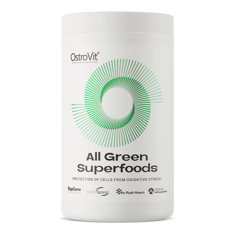 OstroVit All Green Superfoods یک مکمل غذایی جامع است که ترکیبات ارزشمند و مواد فعال زیادی را برای بدن فراهم میکند. این محصول را میتوان در میان سایر محصولات، عصارههای گیاهی مانند عصاره ریشه آشواگاندا یا جینکو بیلوبا و همچنین عصاره قارچها، از جمله کوردیسپس یا قارچ یال شیر، یافت.