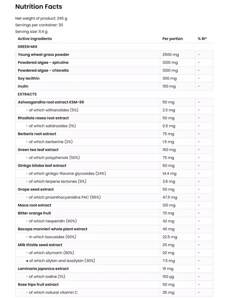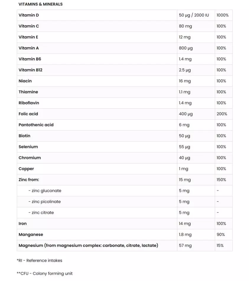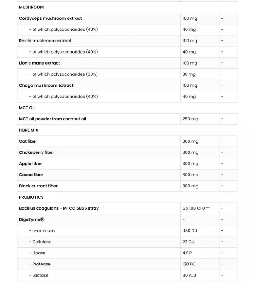 - غنی از مواد مؤثر - بخشی از محصول حاوی مقادیر قابل توجهی عصاره گیاهی، عصاره قارچ و همچنین روغن MCT، فیبر غذایی، پروبیوتیکها، ویتامینها و مواد معدنی و کمپلکس چند آنزیمی DigeZyme® است.