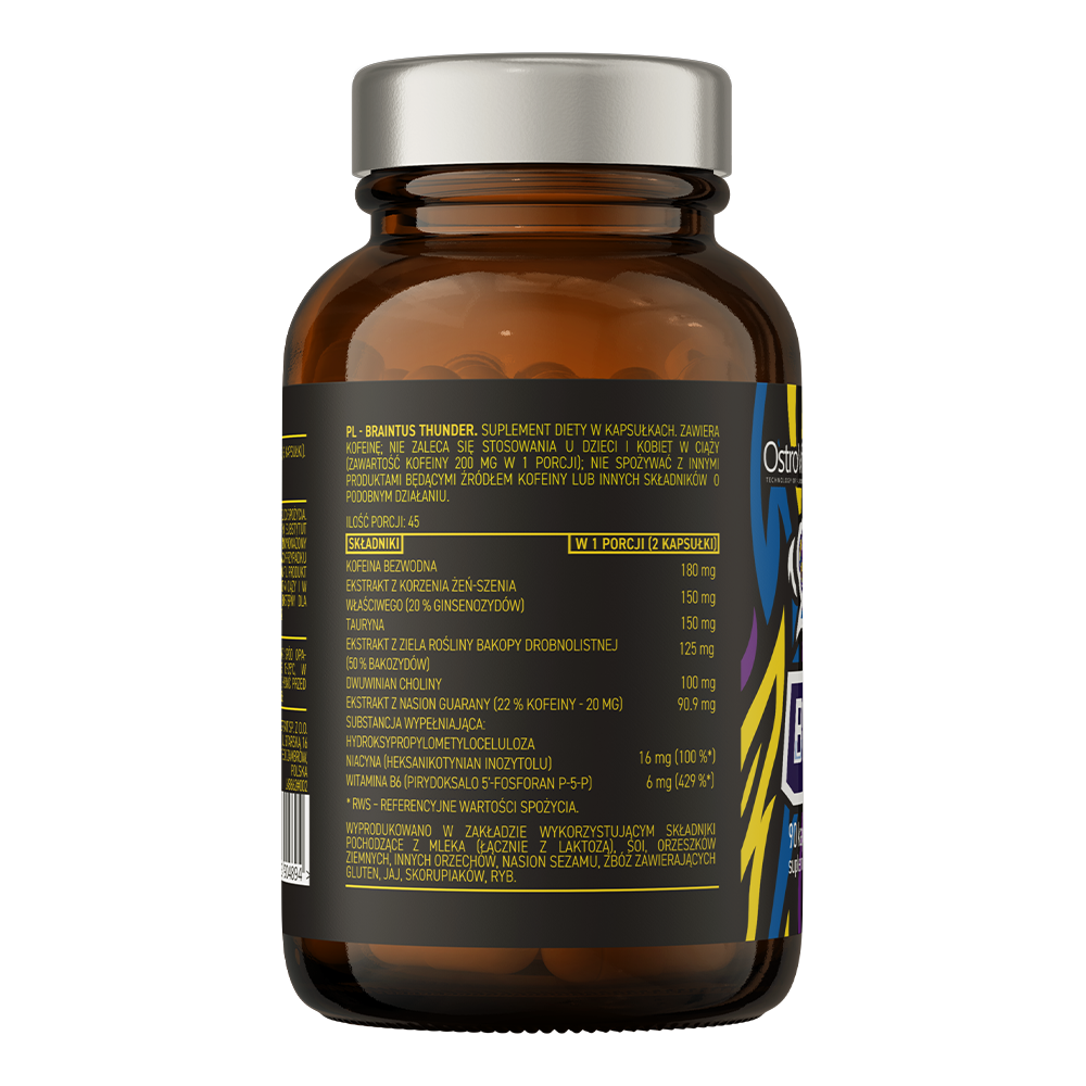 OstroVit Braintus Thunder یک مکمل غذایی جامع است که منبع هشت ترکیب فعال مختلف از جمله تورین، کافئین و عصاره دانه گوارانا میباشد. این محصول به شکل کپسولهای بلع آسان موجود است و برای افرادی طراحی شده است که به تحریک و پشتیبانی از عملکرد بدن اهمیت میدهند.