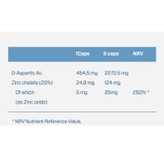 اسید D-Aspartic، ضخیم کننده: سلولز میکروکریستالی، عامل پوشش (هیدروکسی پروپیل متیل سلولز)، دی فسفات کلسیم، عامل ضد رسوب (استئارات منیزیم) و (3.3%) کلات روی (پروتئین برنج، اکسید روی، اسید L-اسپارتیک و اسید سیتریک). ممکن است حاوی مقادیری از شیر، سویا، گلوتن، تخم مرغ، سخت پوستان و ماهی باشد.