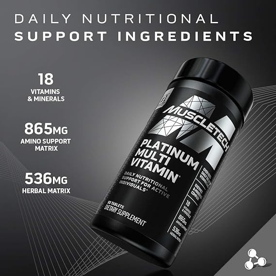 - MULTIVITAMIN FOR MEN – MuscleTech Platinum Multivitamin یک مجموعه مولتی ویتامین پیشرفته و کامل است که برای ورزشکاران نخبه و افراد فعال برای حمایت از سلامت عمومی طراحی شده است.