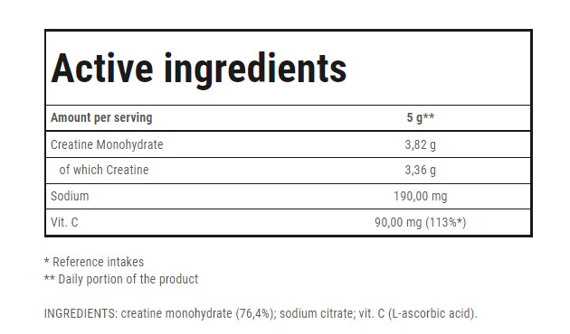 کراتین 100% پودر کراتین مونوهیدرات. کراتین 100% حاوی پودر کراتین مونوهیدرات است. این محصول حاوی ویتامین C و سدیم است. CREATINE 100% حاوی کراتین است که عملکرد بدنی را در دوره های متوالی تمرینات کوتاه مدت و با شدت بالا افزایش می دهد. اثر مفید با مصرف روزانه 3 گرم کراتین به دست می آید. CREATINE 100% برای ورزشکاران متخصص در رشته های قدرت و سرعت-قدرت توصیه می شود. CREATINE 100% برای ورزشکاران حرفه ای طراحی شده است.