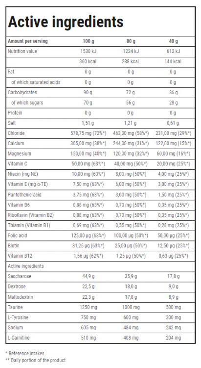 حاوی ال کارنیتین، تورین و مجموعه ای از ویتامین های B، از جمله ویتامین B6، که به کاهش خستگی و خستگی کمک می کند.
