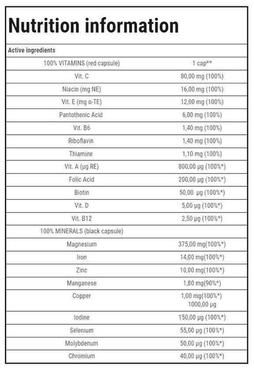 100% VITAMINS & MINERALS محصولی است که از 2 کپسول 100% ویتامین (کپسول روز قرمز) و 100% مواد معدنی (کپسول شب سیاه) تشکیل شده است. این محصول حاوی ویتامین های ضروری B از جمله تیامین، ویتامین B6، ریبوفلاوین و ویتامین B12 است که نقش اساسی در متابولیسم انرژی ایفا می کند و از عملکرد سیستم عصبی پشتیبانی می کند. این محصول حاوی ویتامین های A، C و D است که سیستم ایمنی را تقویت می کند و ویتامین E که از سلول ها در برابر استرس اکسیداتیو محافظت می کند. منیزیم موجود در این محصول خستگی و خستگی را کاهش می دهد، در حالی که ید و سلنیوم تیروئید سالم را تضمین می کنند. این محصول منبع روی، یک ماده معدنی مهم برای مردان است که به حفظ سطح کافی تستوسترون خون کمک می کند.