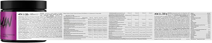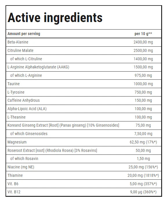 بتا آلانین، سیترولین مالات، ال-سیترولین، ال-آرژنین آلفاکتوگلوتارات (AAKG)، که از این میان ال-آرژنین، تورین، ال-تیروزین، کافئین بی آب، آلفا لیپوئیک اسید، ال-تینین، عصاره جینسینگ کره ای [ریشه ] (Panax ginseng) [10% جینسنوزیدها] که از آن جینسنوزیدها، منیزیم، عصاره روزروت [ریشه] (Rhodiola Rosea) [3٪ روزاوین]، که از این میان روزاوین، نیاسین (mg NE)، تیامین، VIt. B6، ویتامین B12، بتا آلانین؛ سیترولین مالات؛ ال-آرژنین آلفا کتوگلوتارات؛ تورین؛ ال-تیروزین؛ عامل ضد کیک - دی اکسید سیلیکون، طعم دهنده ها؛ مالتودکسترین ها؛ کافئین بی آب؛ اسید آلفا لیپوئیک؛ L-theanine; عصاره جینسنگ کره ای [ریشه] (جین سینگ Panax) [10٪ جینسوزید]; منیزیم (نمک های منیزیم اسید سیتریک؛ کربنات منیزیم؛ اکسید منیزیم)؛ ضخیم کننده ها - صمغ سلولزی؛ عصاره گل سرخ [ریشه] (Rhodiola Rosea) [3% Rosavins]; شیرین کننده ها - سوکرالوز، سیکلامات سدیم، ساکارینات سدیم؛ نیاسین (نیکوتینامید)؛ تیامین (تیامین هیدروکلراید)؛ vit. B6 (پیریدوکسین هیدروکلراید)؛ vit. B12 (5'-deoxyadenosylcobalamin).