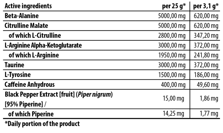 بتا آلانین. سیترولین مالات؛ مالتودکسترین؛ ال-آرژنین آلفا کتوگلوتارات؛ تورین؛ ال-تیروزین؛ ضخیم کننده (دی اکسید سیلیکون)؛ کنسانتره آب چغندر برای طعم پرتقال خونی؛ طعم دهنده ها؛ تنظیم کننده اسیدیته برای طعم پرتقال خون و طعم صمغی ترش (اسید سیتریک)؛ کافئین بی آب؛ کنسانتره آب هویج سیاه برای طعم پرتقال خونی و طعم زغال اخته یخ. شیرین کننده (سوکرالوز)؛ رنگ برای طعم پرتقال خون و طعم صمغی ترش (بتا کاروتن)؛ عصاره فلفل سیاه [میوه] (Piper nigrum) [95% پیپرین].
