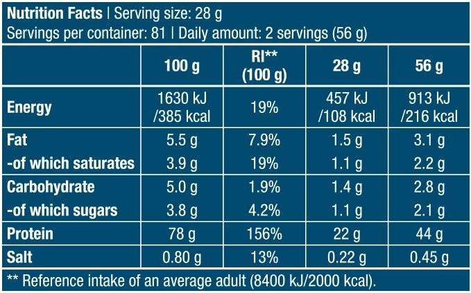 پروتئینهای آب پنیر ۹۰٪ {کنسانتره پروتئین آب پنیر، پروتئین آب پنیر ایزوله [پروتئین آب پنیر ایزوله، امولسیفایر: لسیتین (سویا)}، ال-گلوتامین ۲.۹٪، طعمدهندهها، غلیظکننده (صمغ سلولز)، خامهساز [چربی نارگیل تا حدی هیدروژنه، پودر شیر بدون چربی، امولسیفایرها (E471، E472a)، شربت گلوکز، ساکارز، پروتئین شیر، تثبیتکننده (فسفات پتاسیم)، عامل ضد کلوخه شدن (فسفات کلسیم)]، ال آرژنین، ال-لوسین ۰.۲٪، نمک، ال-ایزولوسین ۰.۱٪، ال-والین ۰.۱٪، شیرینکننده (سوکرالوز)، رنگ (تارترازین)***. *** تارترازین: ممکن است تأثیر نامطلوبی بر فعالیت و توجه کودکان داشته باشد. ساخته شده در کارخانهای که شیر، تخم مرغ، گلوتن، سویا، سختپوستان، دی اکسید گوگرد و غذاهای حاوی آجیل تولید میکند.