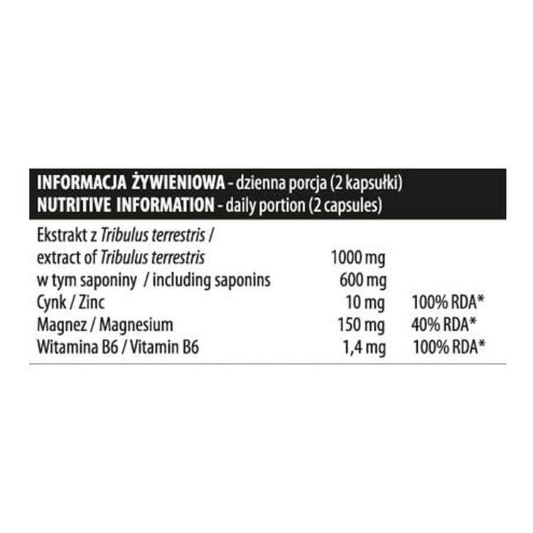 ترکیبات: عصاره گیاه خارخاسک (60 درصد ساپونین)، اکسید منیزیم – منیزیم، ماده ضد جوش E470b، ماده ضد جوش E470b، روی دیگلیسینین روی، ویتامین B6 – پیریدوکسین کلروکسید، ترکیبات پوسته: ژلاتین، رنگ E171، E132. محصول ممکن است حاوی گندم کمی از سویا، و آجیل باشد. محتویات بسته: 90 کپسول. 1 کپسول به وزن 800 میلی گرم گرم.