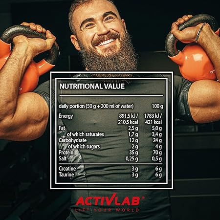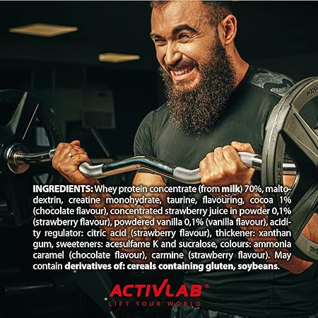کنسانتره پروتئین آب پنیر (از شیر ) 70٪، مالتودکسترین، کراتین مونوهیدرات، تورین، طعم دهنده ها، کاکائو 1٪ (طعم شکلاتی)، آب توت فرنگی غلیظ در پودر 0.1٪ (طعم توت فرنگی)، وانیل پودر شده 0.1٪ (طعم وانیل) چربی شیر (طعم فاج)، تنظیم کننده اسیدیته: اسید سیتریک (طعم توت فرنگی)، غلیظ کننده: صمغ زانتان، شیرین کننده ها: استه سولفام K و سوکرالوز، رنگ: کارامل آمونیاکی (طعم: شکلات، کارامل شور، فاج)، کارمین (طعم توت فرنگی) کاروتن ها (طعم ها: کارامل شور، فاج)، نمک (طعم کارامل شور).