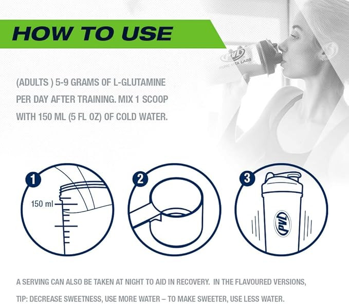 (بزرگسالان) 5-9 گرم ال-گلوتامین در روز بعد از تمرین. 1 پیمانه را با 150 میلی لیتر (5 اونس) آب سرد مخلوط کنید.