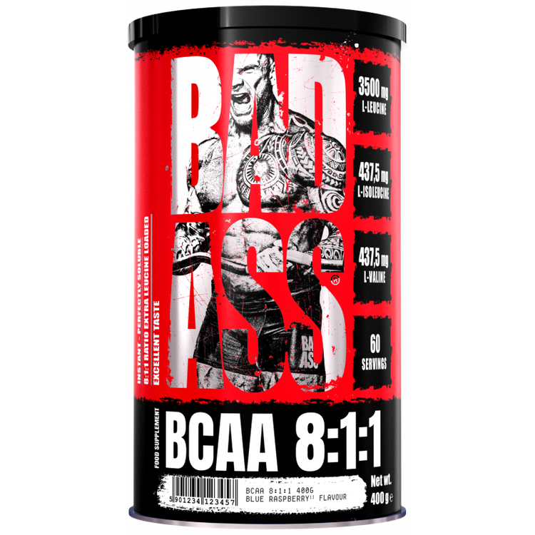 BAD ASS® BCAA 8:1:1. مکمل غذایی. با شیرین کننده ها مجموعه آمینو اسیدهای زنجیره ای با نسبت 8:1:1. این محصول برای افرادی که فعالیت بدنی بیشتری دارند در نظر گرفته شده است.