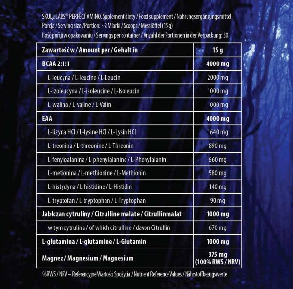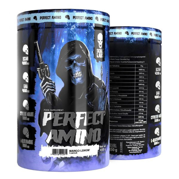 SKULL LABS® PERFECT AMINO. مکمل غذایی. با شیرین کننده ها فرمول اسید آمینه قبل و بعد از تمرین، طراحی شده برای ورزشکاران تمرینات قدرتی و افراد فعال بدنی.