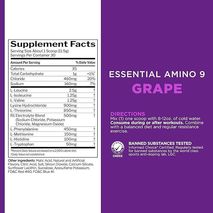 آمینو ضروری 9، 7.5 گرم از تمام 9 اسید آمینه ضروری را با الکترولیت های اضافه شده برای هیدراتاسیون ارائه می دهد. این مکمل همچنین حاوی 5 گرم بی سی ای ای و 500 میلی گرم الکترولیت اضافه شده است.